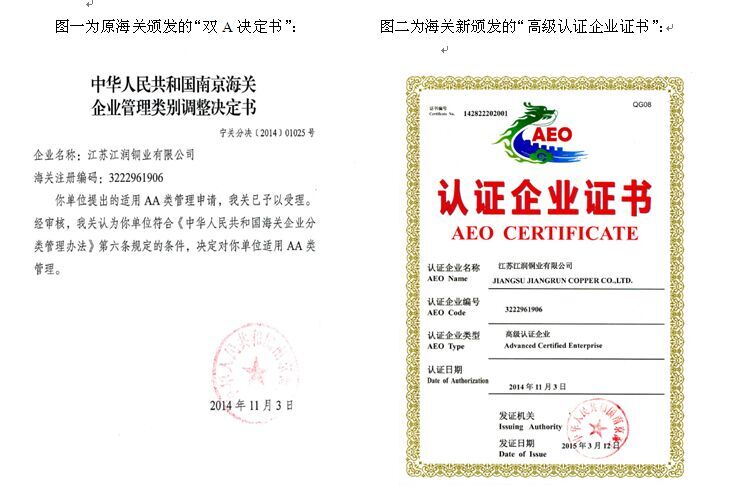 2015年7月30日,由無錫關檢貿(mào)組織的“共創(chuàng)共建”啟動儀式在無錫隆重舉行,參會企業(yè)共十五家。會議議程為原無錫市15家海關AA類管理的企業(yè)直接過渡為海關高級認證企業(yè)。江蘇江潤銅業(yè)有限公司榮獲由南京海關頒發(fā)的“高級認證企業(yè)”的稱號,公司總經(jīng)理駱偉棟參會并領獎。《中華人民共和國海關企業(yè)信用管理暫行辦法》去年12月1日實施后,海關注冊企業(yè)的管理類別從原來的AA、A、B、C、D類劃分,改為按企業(yè)信用狀況劃分為認證企業(yè)、一般信用企業(yè)和失信企業(yè),其中認證企業(yè)又分為一般認證企業(yè)和高級認證企業(yè)。認證企業(yè)在通關時適用較低的貨物查驗率,單證審核程序相對簡化,并可以優(yōu)先辦理海關通關手續(xù)?! 「呒壵J證企業(yè),除享有一般認證企業(yè)的通關便利外,其進出口貨物在確定商品歸類、原產(chǎn)地確定、海關估價和辦結(jié)其他海關手續(xù)前可先行驗放,由海關統(tǒng)一設立協(xié)調(diào)員,提供便捷通關服務。走出國門后,高級認證企業(yè)更可享受與中國實現(xiàn)AEO互認國家或地區(qū)海關提供的通關便利,這相當于直接獲得一張在全球有關國家或地區(qū)快速通關的VIP卡。