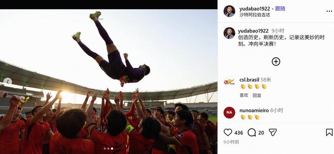 于大寶社媒慶祝U23國足進四強:創造歷史,刷新歷史!